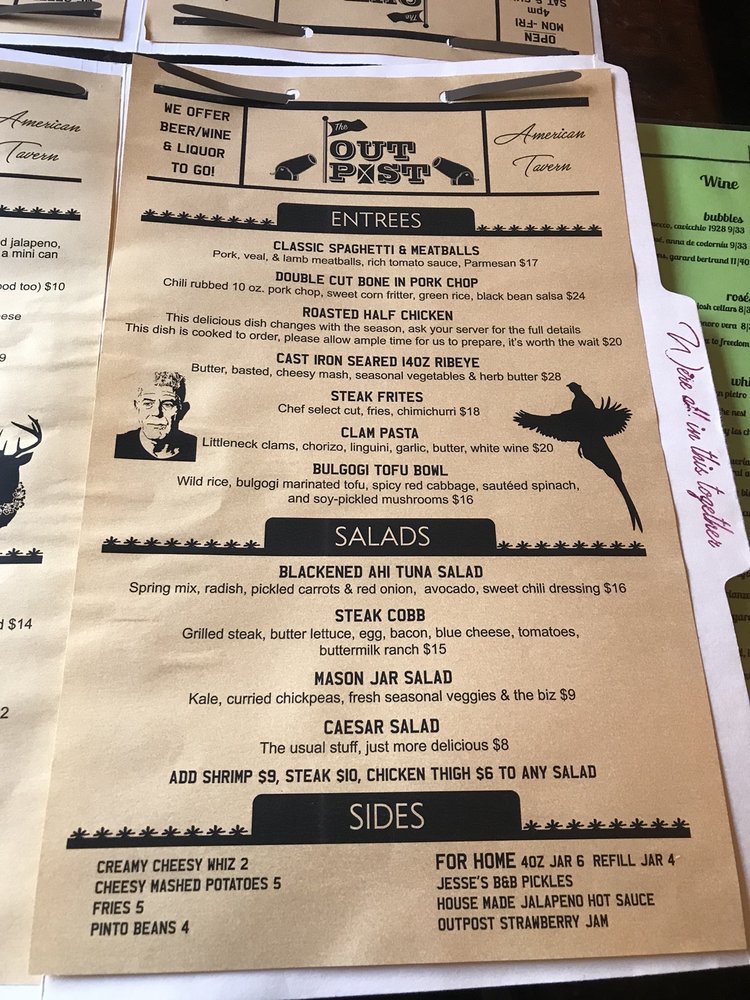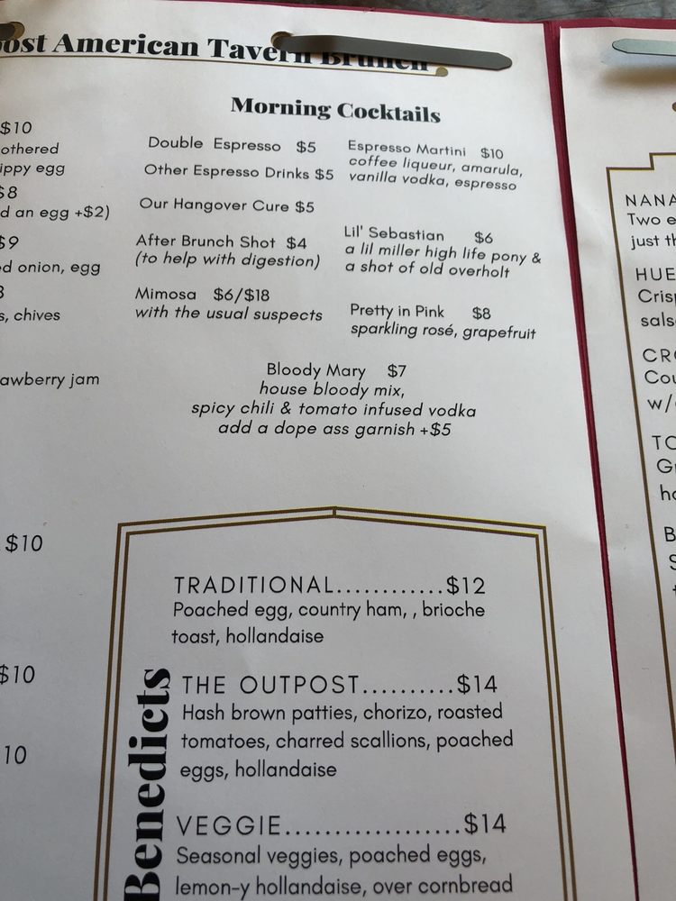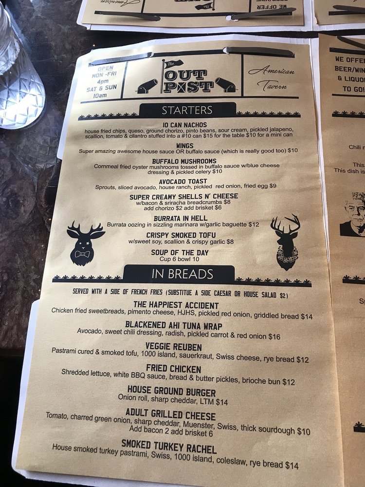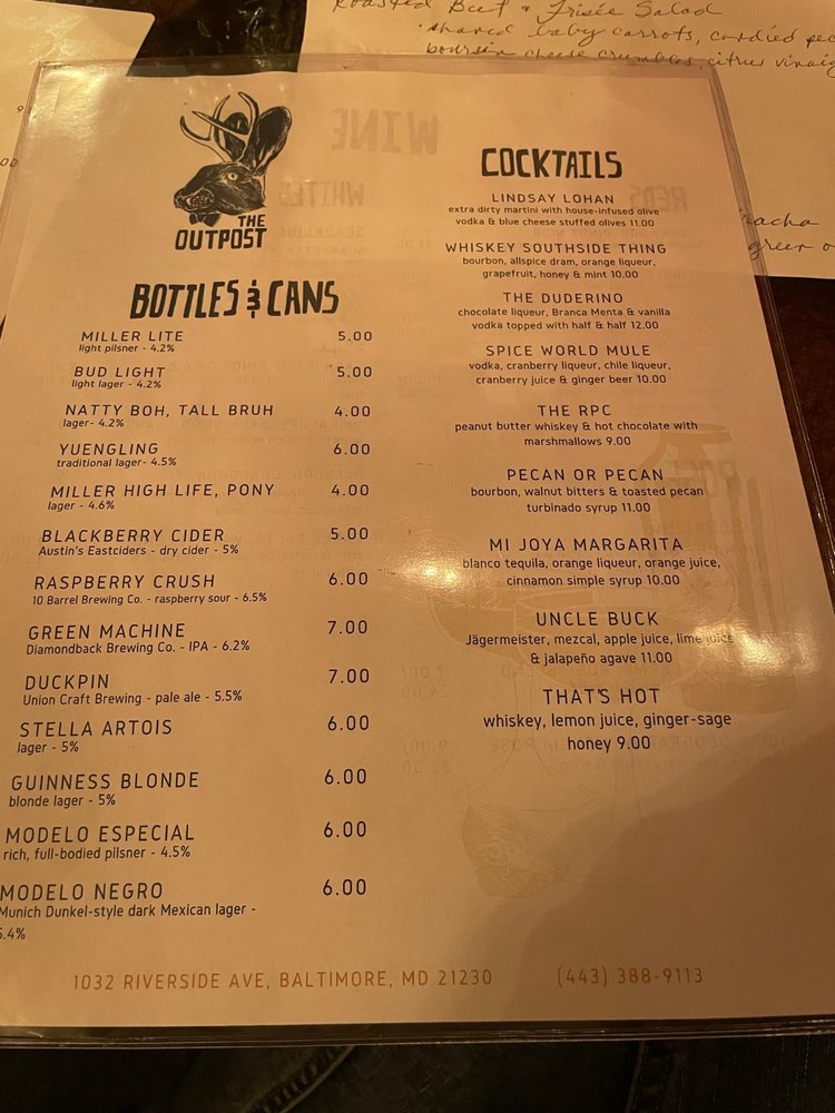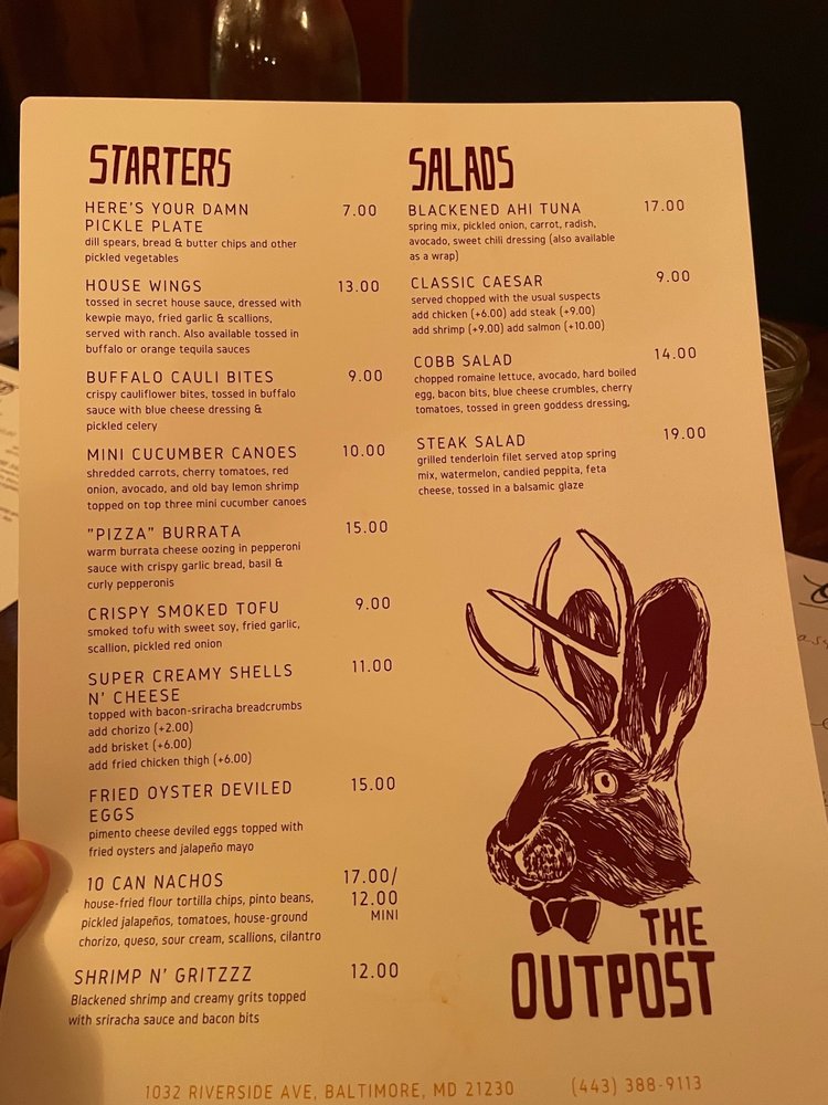 Introducing The Outpost American Tavern, a hipster and casual bar in Baltimore's Federal Hill area. Known for their tin can nachos and mouth-watering burgers, this cozy spot offers a variety of dishes with hints of Asian and Southern cuisine. The friendly staff is attentive and the ambiance is perfect for watching a game. The menu features creative sandwiches like the Wild Monk Roll and innovative entrees such as the Wagyu Hanger Steak. Customers rave about the delicious food, especially the nachos and deviled eggs. While parking can be a challenge, the warm and welcoming atmosphere makes it worth a visit. Don't miss out on their brunch menu and happy hour specials. Experience the charm of The Outpost American Tavern for yourself.